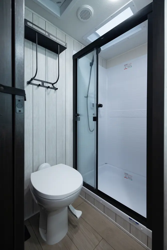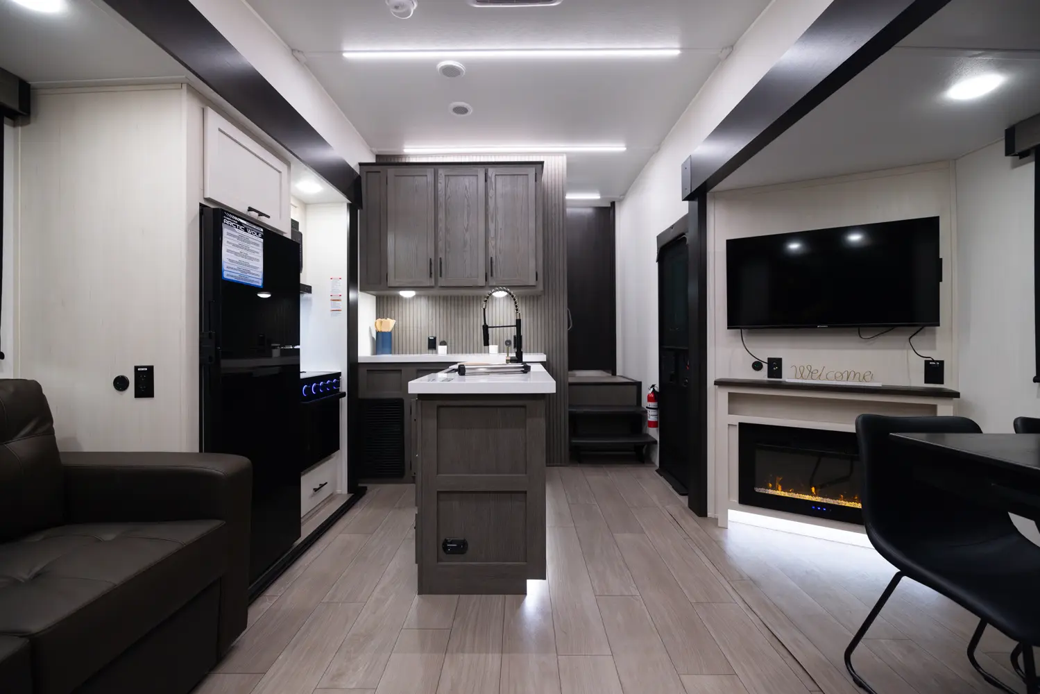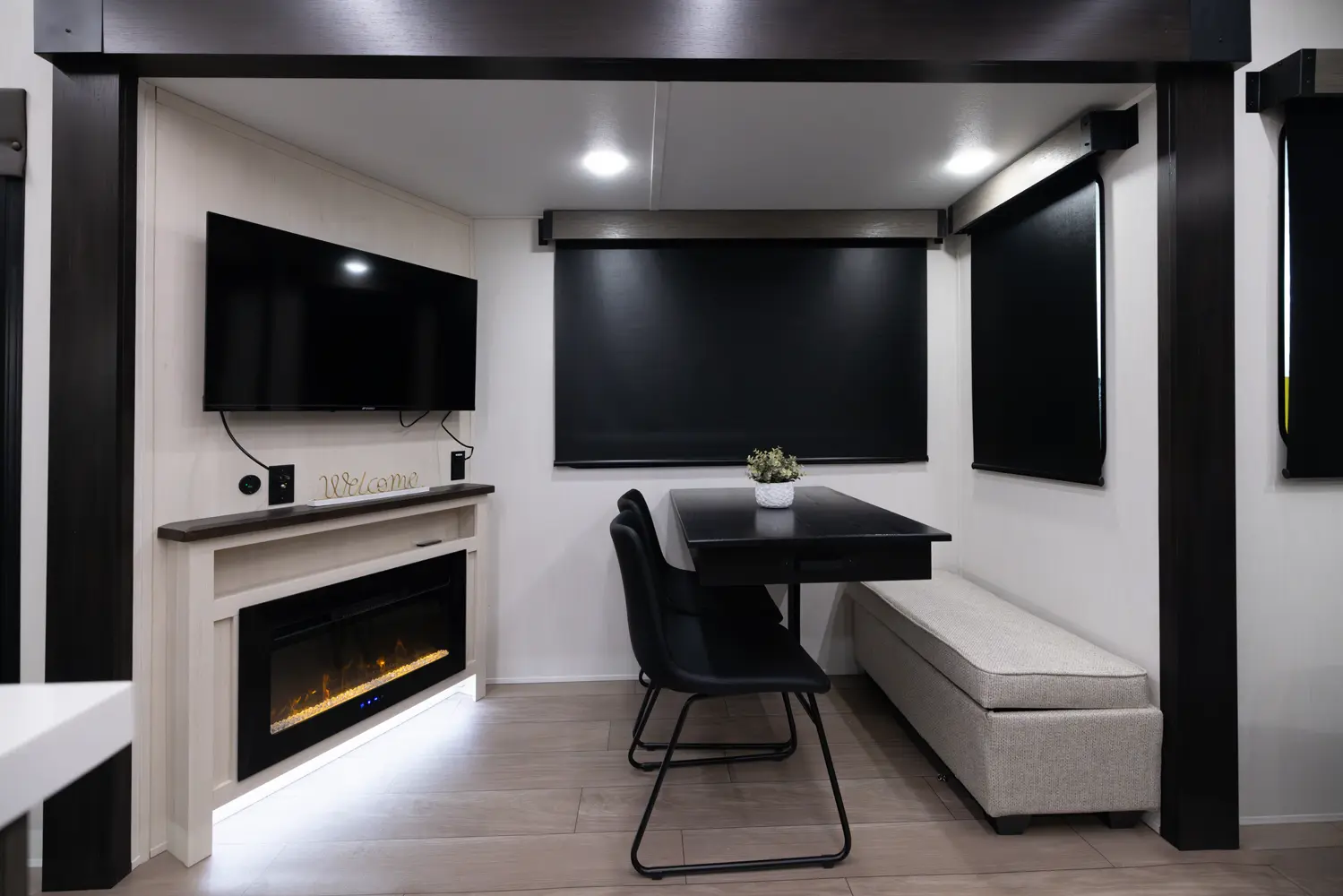 Optimized for couples but enough space for company, this coach has it all! Interior highlights include a convenient wine rack, two relaxing recliners, a free-standing table with chairs and storage ottoman seat, electric fireplace, removable shower rod for hang-drying, panoramic windows at every turn, and a tankless water heater. Exterior features include a 15,000 BTU A/C, security camera system prep, and one-touch auto leveling for easy setup!