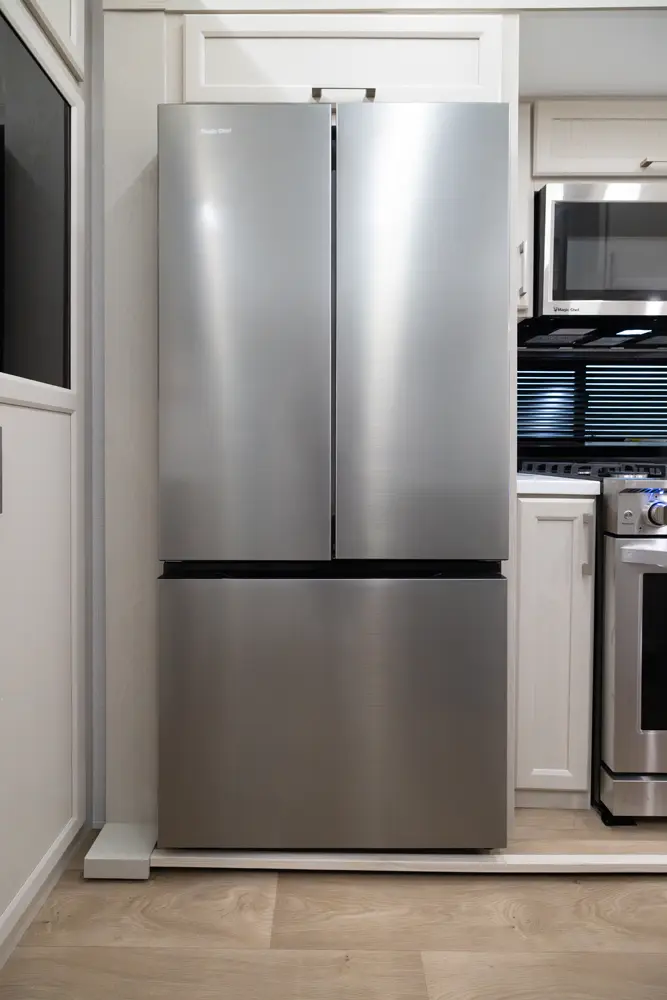• Stainless Steel Residential Style Appliance Package w/18 Cu Ft 12V Refer and Large Range