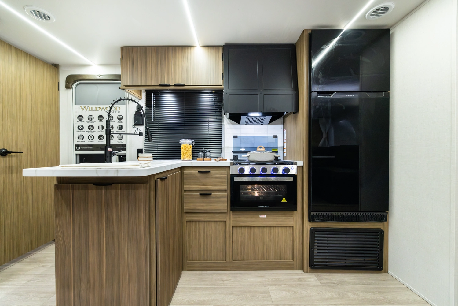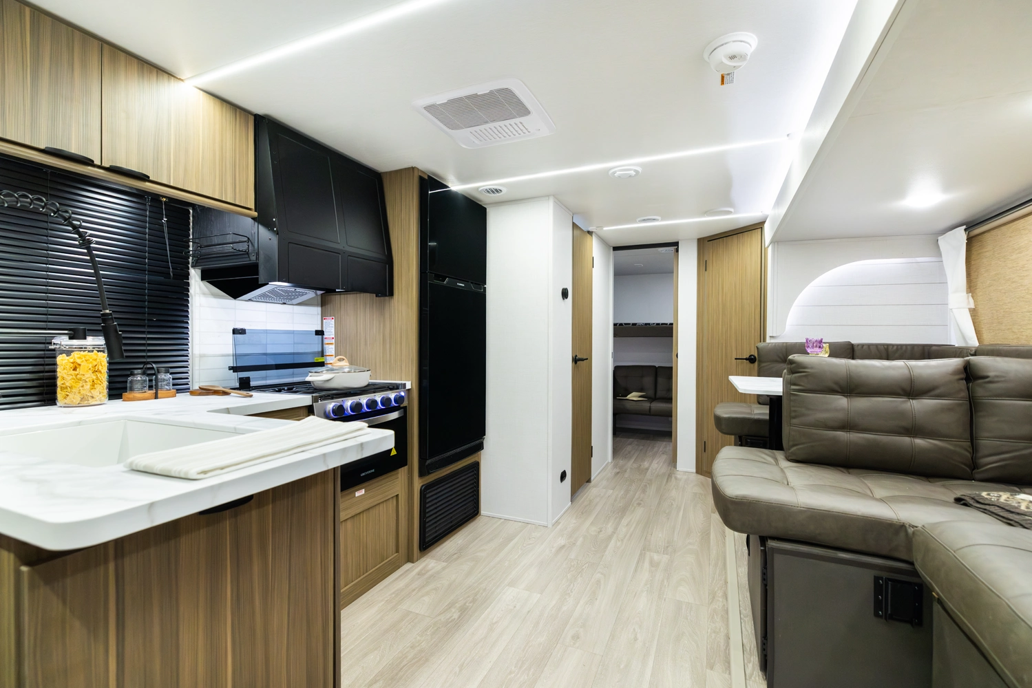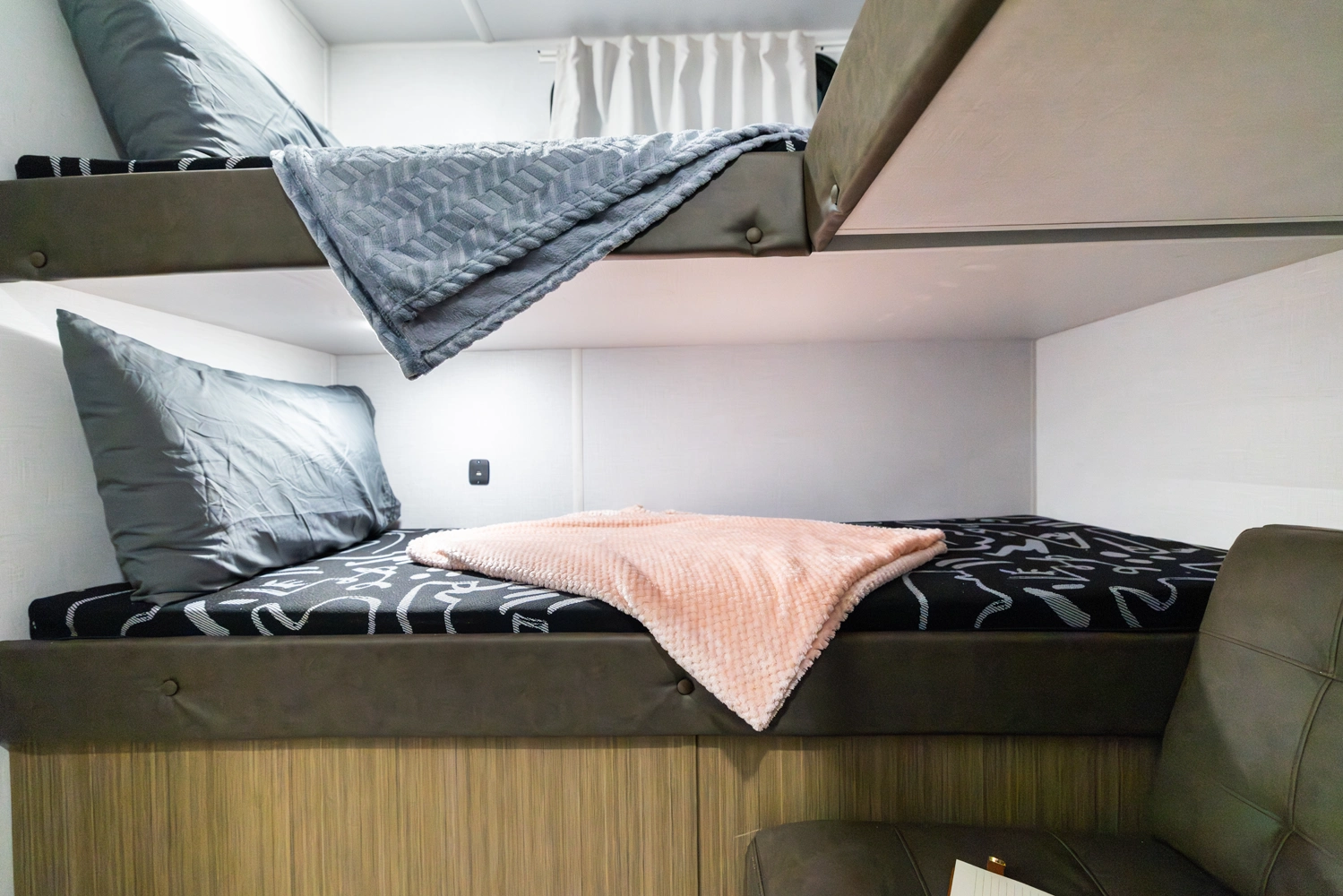 The 273QBXL is a versatile, lightweight bunkhouse that weighs in at less than 6,000 lbs. This travel trailer is packed with features, including bunks, an outside kitchen, U-dinette, Versa-Lounge, and walk-in shower. The kitchen includes an oversized 11 CU. FT. refrigerator, stovetop, oven, and pantry.