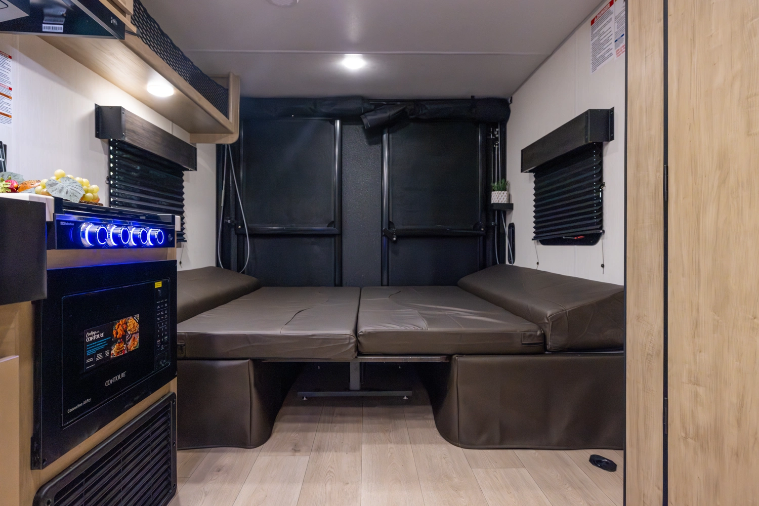 The Cherokee Grey Wolf 22RR by Forest River is the ultimate RV for outdoor enthusiasts. The spacious toy hauler garage, with a convertible rear ramp, provides ample space for toys and gear. The outdoor kitchen, shower, and patio area offer a luxurious outdoor living experience. Inside, you'll find a comfortable bedroom with a walk-around queen bed and a well-appointed bathroom. The modern kitchen, with its black stainless steel farm sink and sink cover, is perfect for cooking and entertaining.