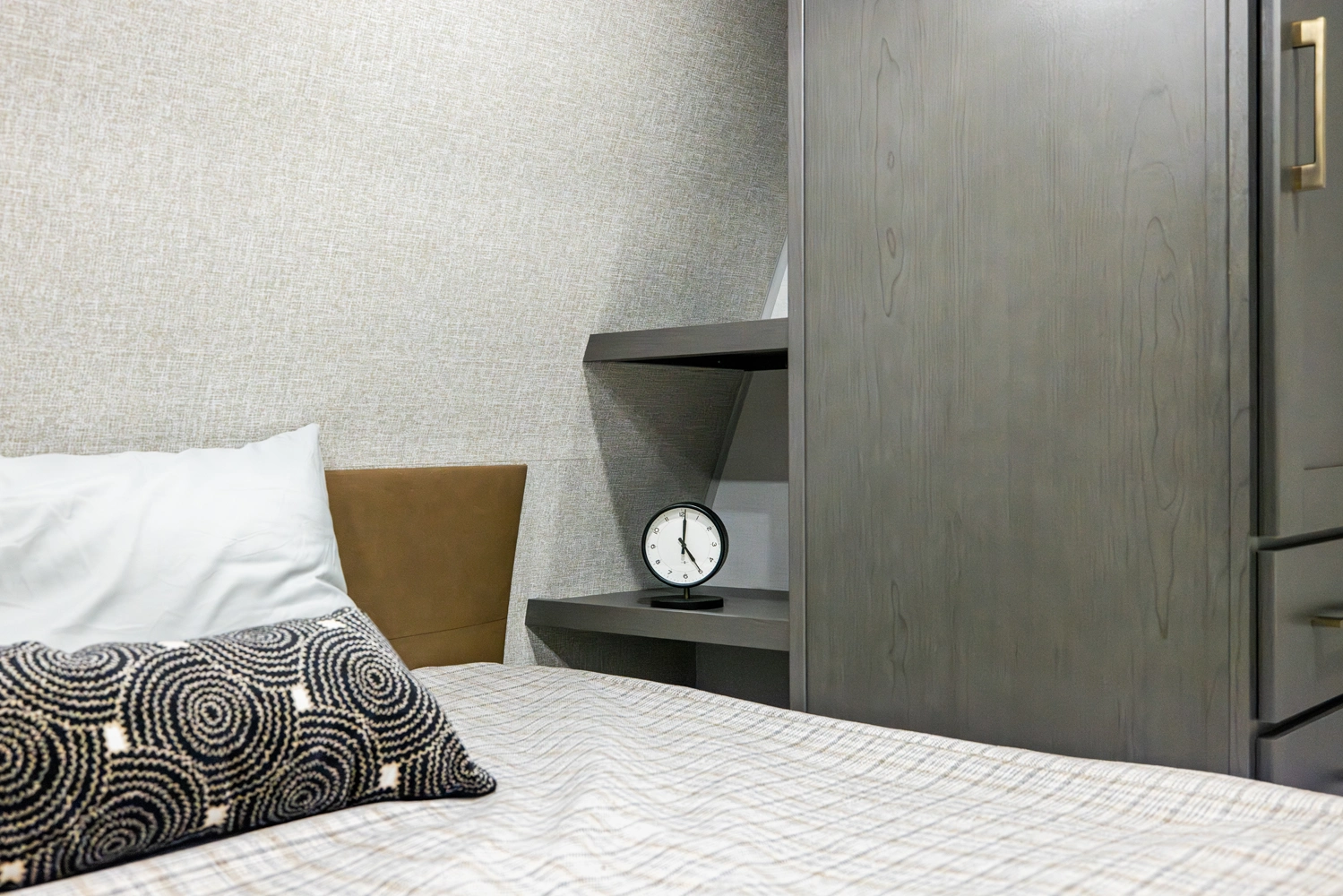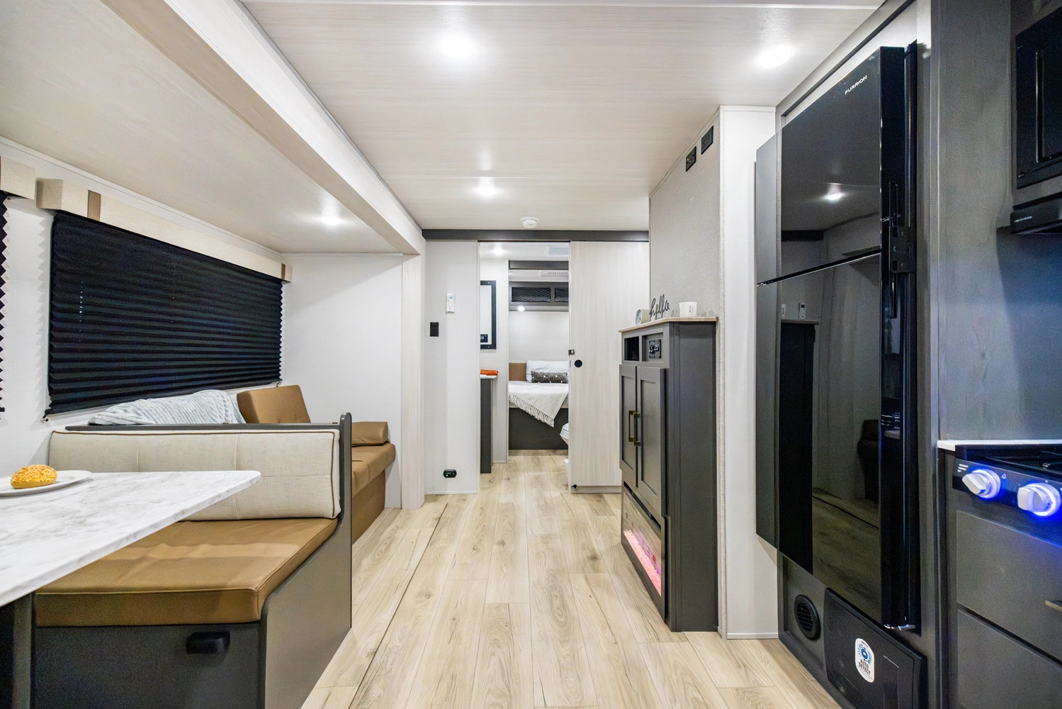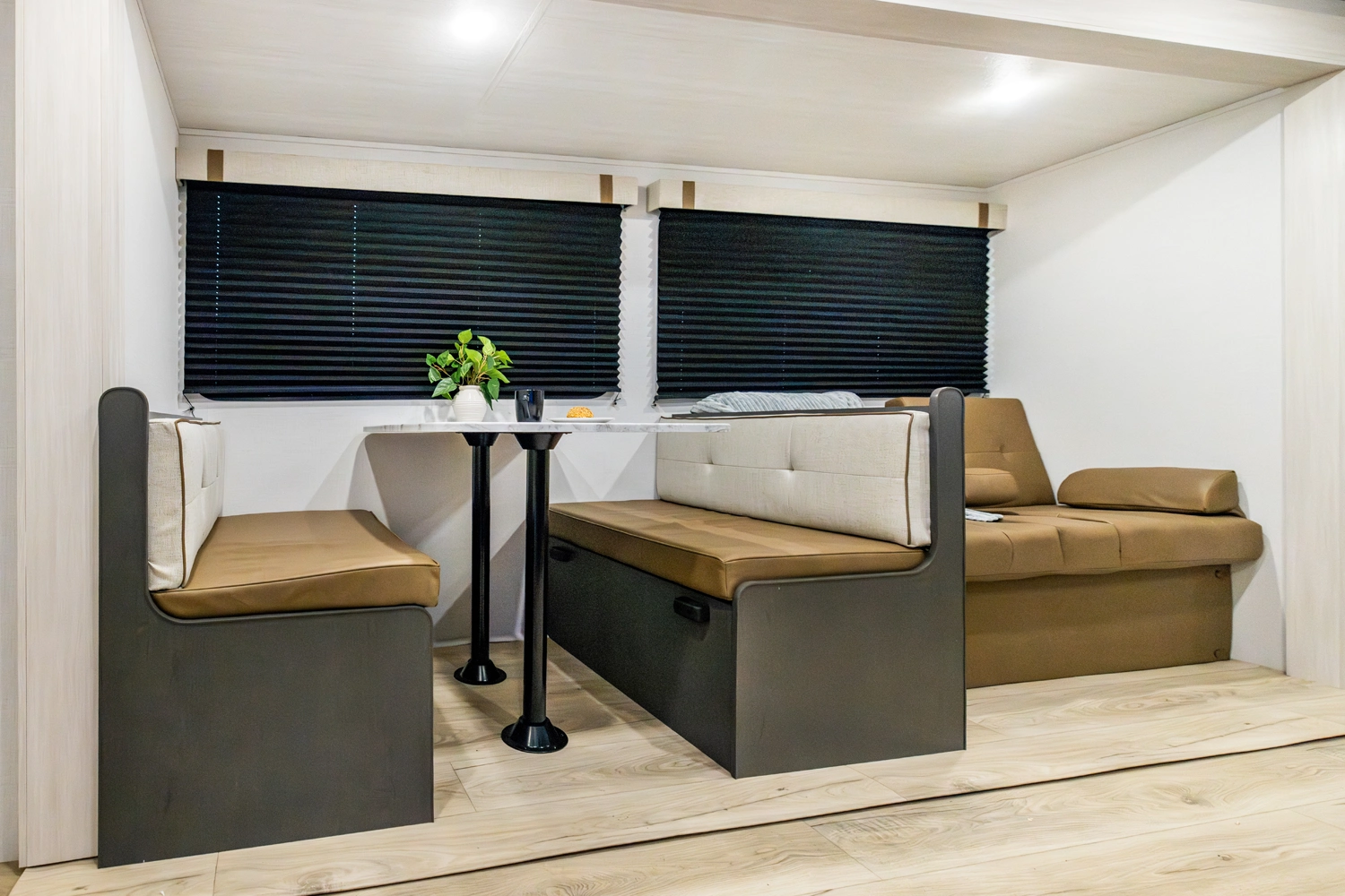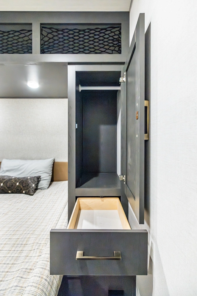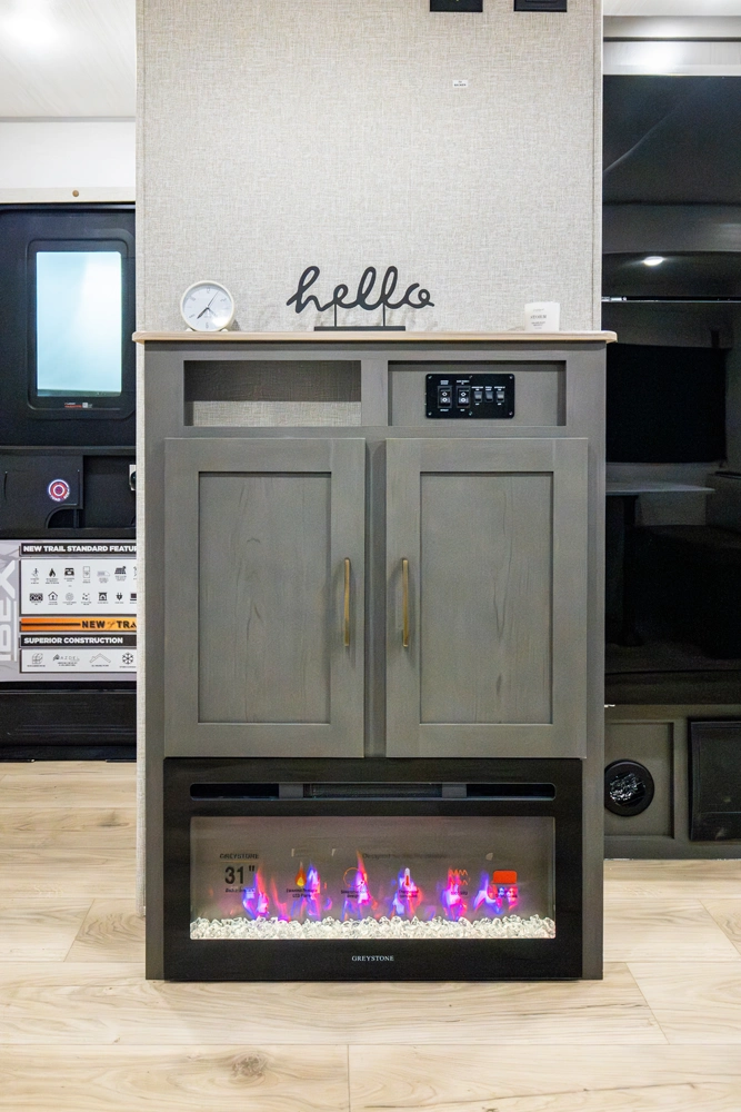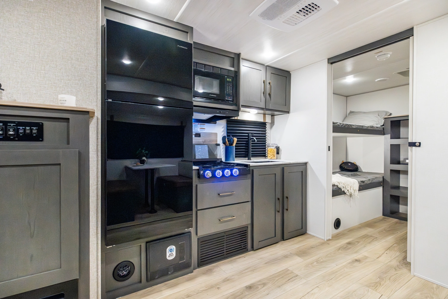 The Ibex New Trail Edition TRAIL28 features a front queen bed, central living area with sofa and dinette, a full kitchen, and a walk-through bath. A private rear bunk room offers four bunks and extra storage. Includes washer/dryer prep, tankless water heater, 50-amp service, and designed with superior construction.