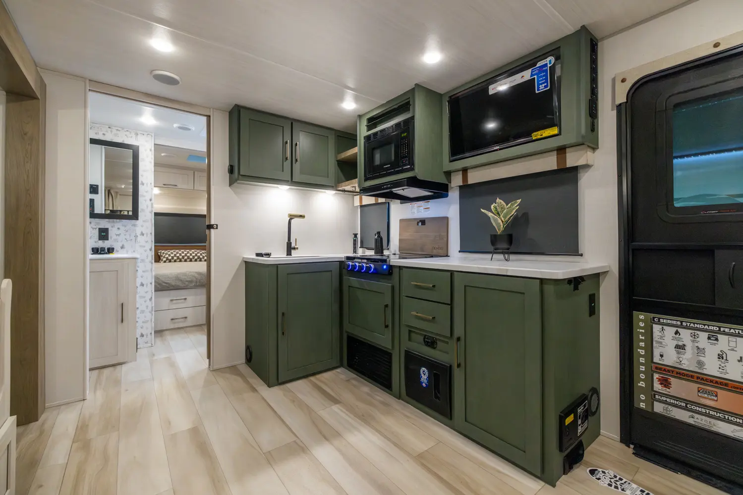 Spacious and family-friendly, this travel trailer features a front queen bedroom with dual wardrobes, central kitchen with large fridge and air fryer microwave, booth dinette slide-out, rear double bunks, and walk-through bath. Built for extended-season use with heated enclosed underbelly, radiant foil insulation, 12V tank pads, 21' power awning, outdoor griddle, and pass-through storage, ready for any adventure.