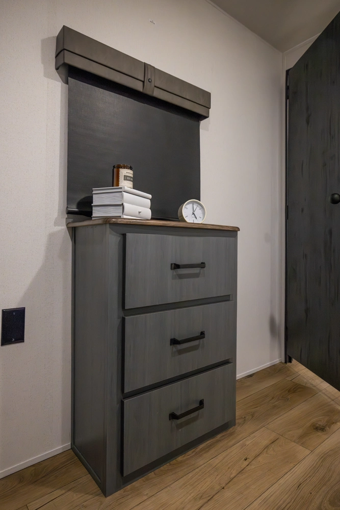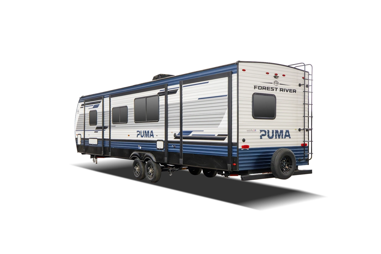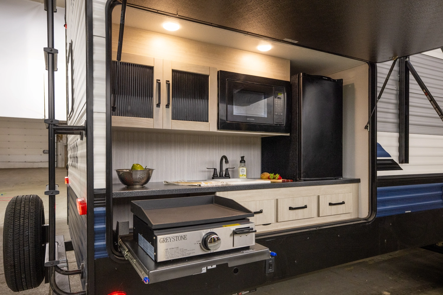 This rear bunk travel trailer provides great space for you and all of your family. With three slides, all on one side of the unit, it will grant you and the guests room everywhere you go. The L shaped countertop in the kitchen gives you the ability to entertain without feeling cramped. The front bedroom has a slide out containing a bed, along with a deep closet. Furthermore, you are provided with a great deal of natural light through out with windows in every room.