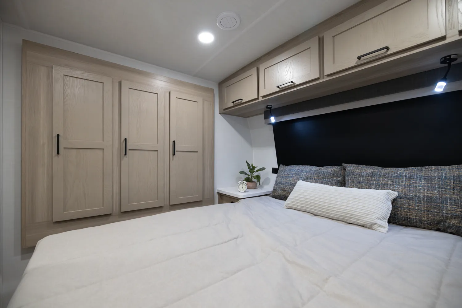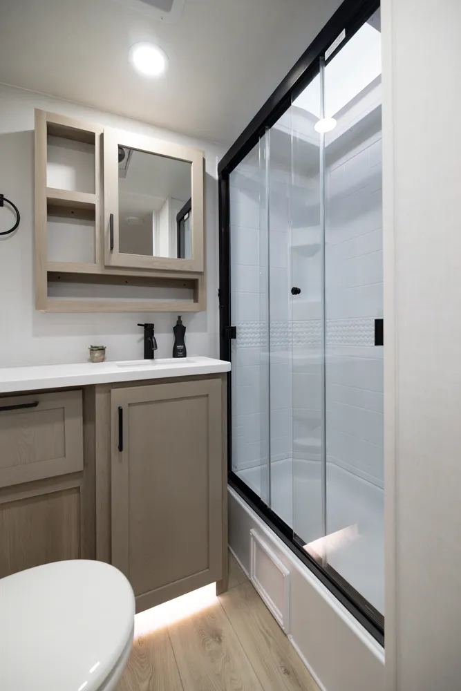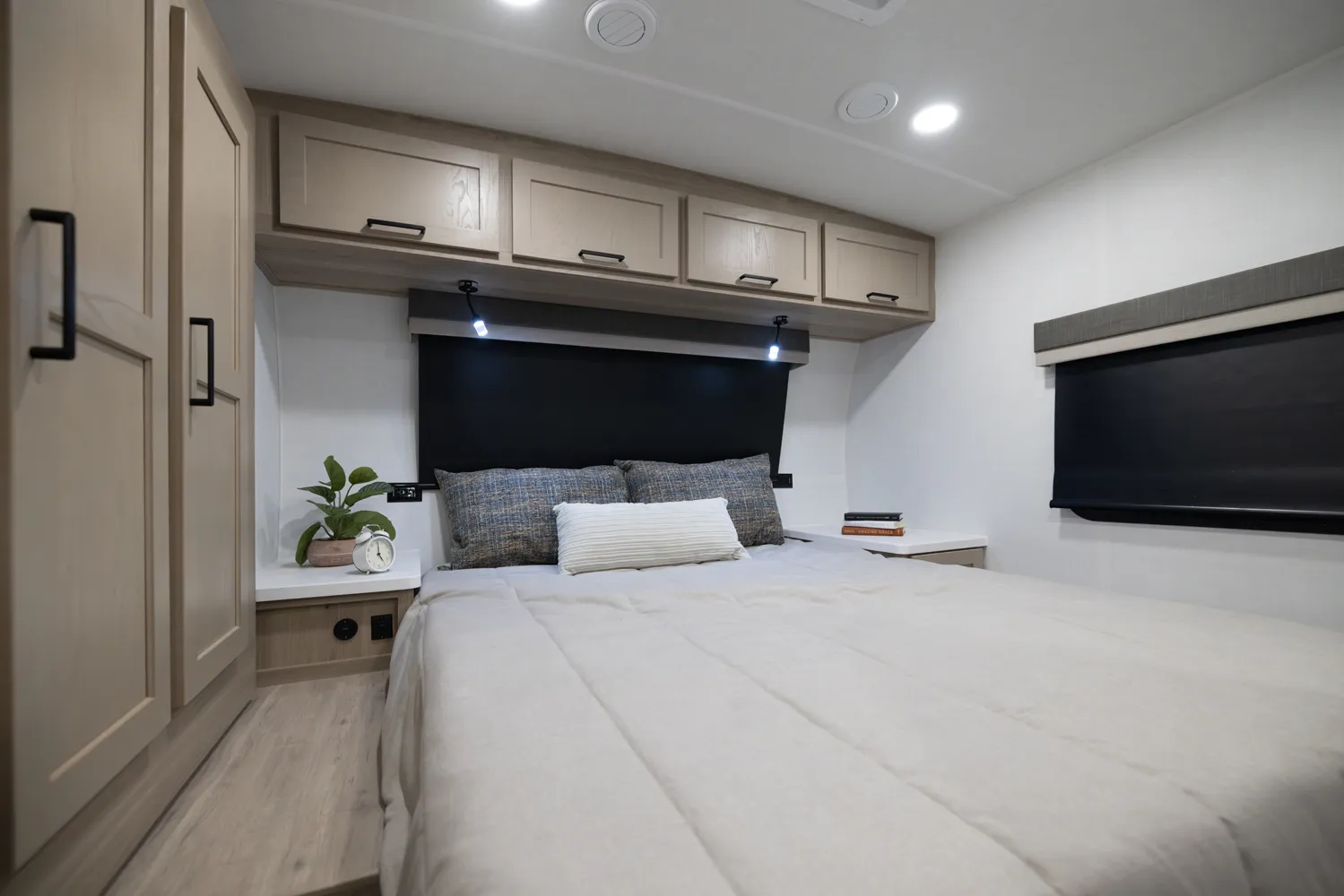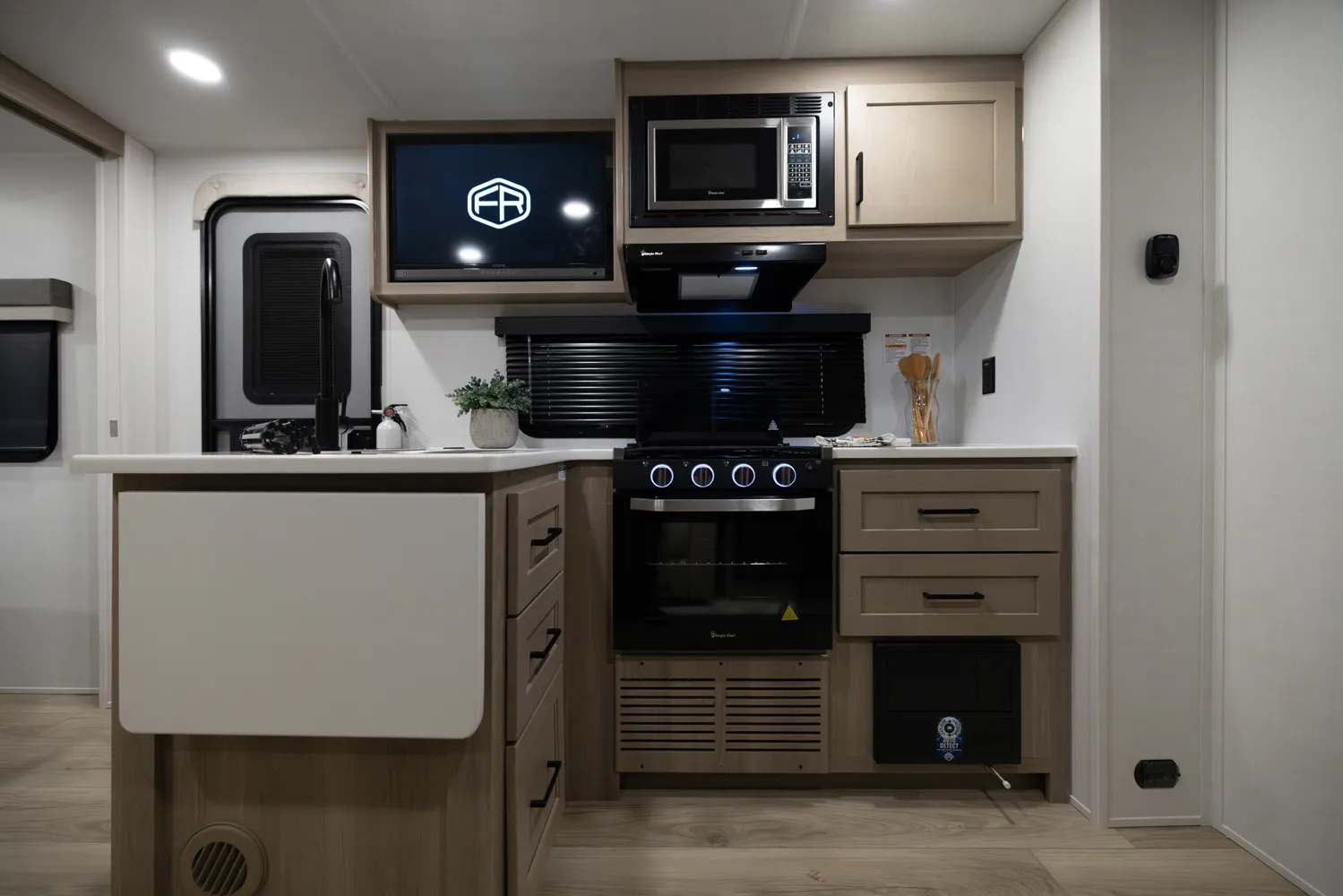 The outside kitchen on this Rockwood Mini Lite featuring our new griddle, a refrigerator and grill makes cooking so enjoyable and flexible. No need to take the smell of cooking bacon inside. The large wardrobe slide makes packing and organization so easy. The large pantry next to the bathroom covers all your kitchen storage needs as well. The center position of the television in your entertainment spaces makes viewing from any part of the living quarters easy.