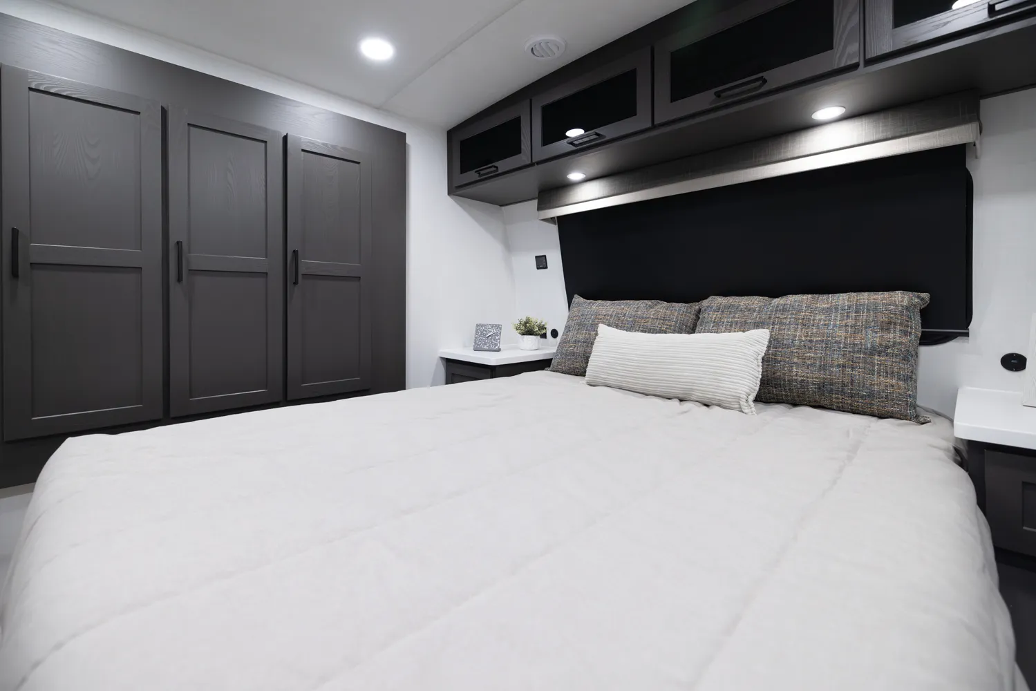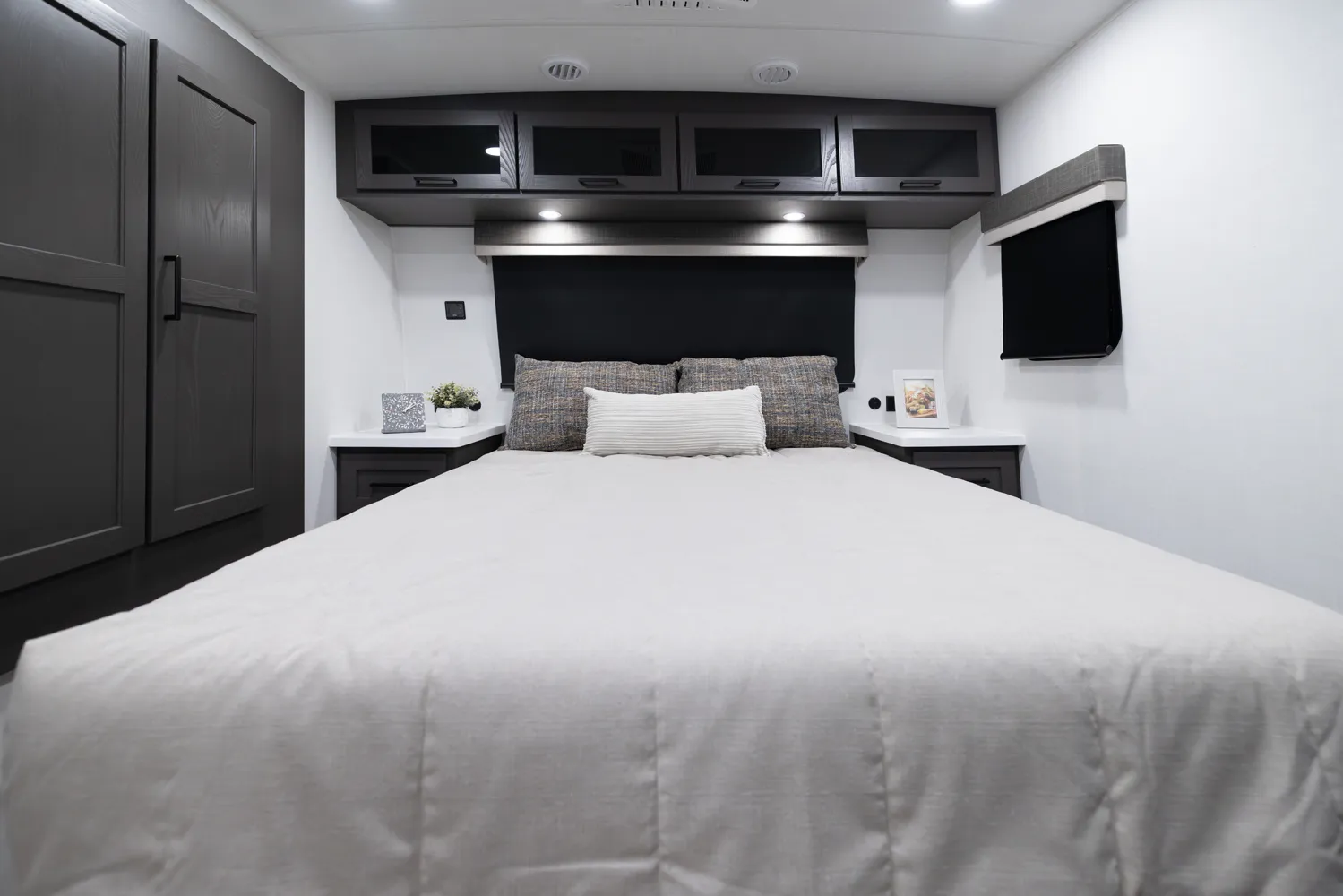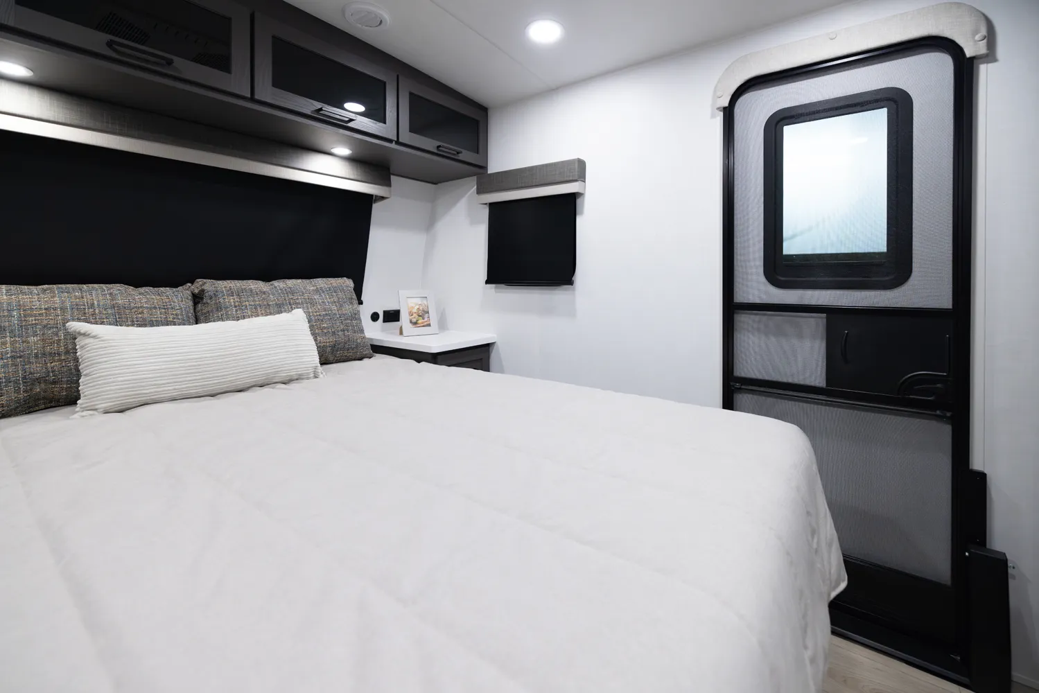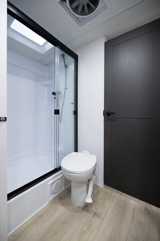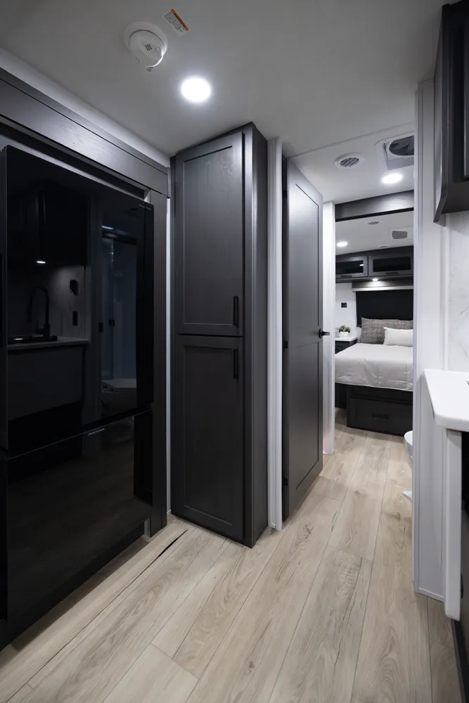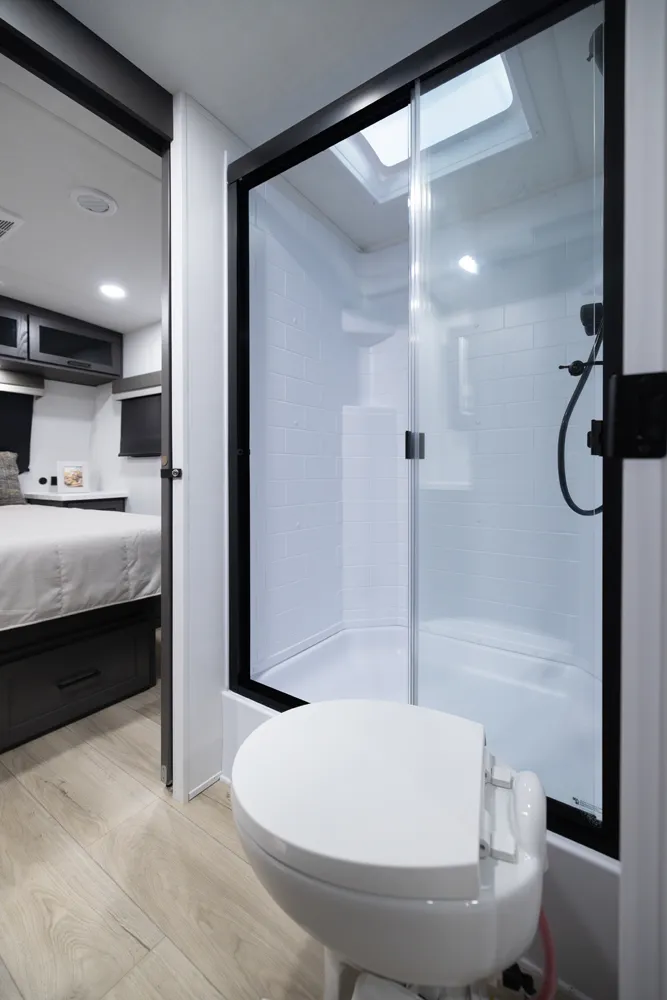The 2618RD features a front bedroom with a true queen bed and wardrobe slide. Two entry doors provide easy access to the bedroom, large pass-through bathroom, and kitchen even when slides are in. The rear U-shaped dinette and 67" theater seat create a spacious, comfortable living area, making the 2618RD perfect for couples or small families.