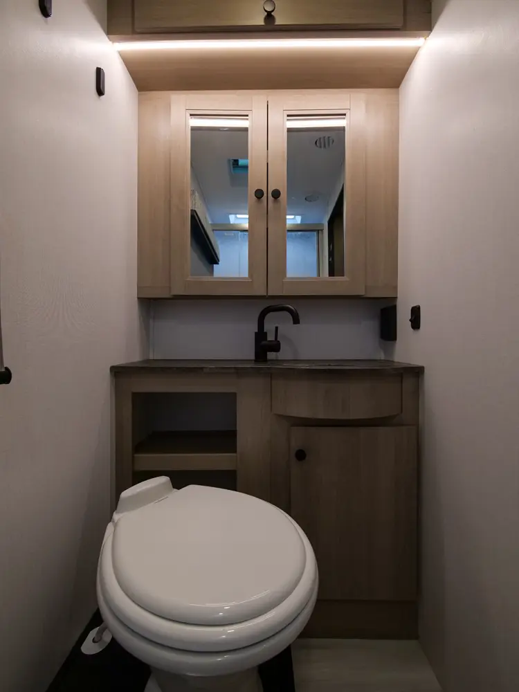 The 2400T is the perfect couple's coach, with a full rear bathroom, galley kitchen, and queen Murphy bed/sofa combo. There's a 54" x 80" cab over bunk for additional sleeping and storage space—or you can choose to add the optional Trekker cap with a built in entertainment center. This unit features a hidden storage area behind the 12V TV. And you never know when someone might sleep on the power theater seats. The 2400T is built on the Mercedes Benz Diesel 3500 chassis.
