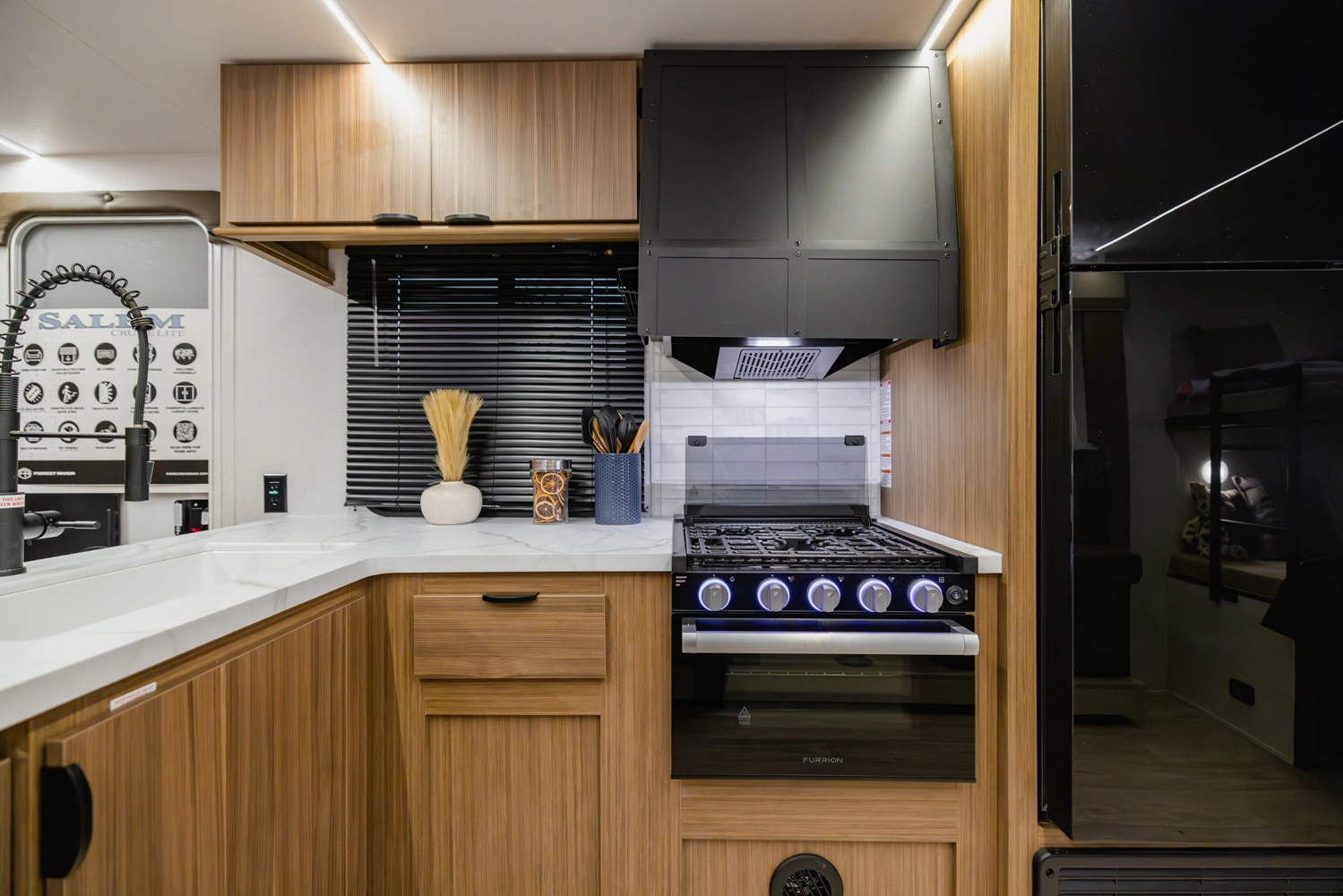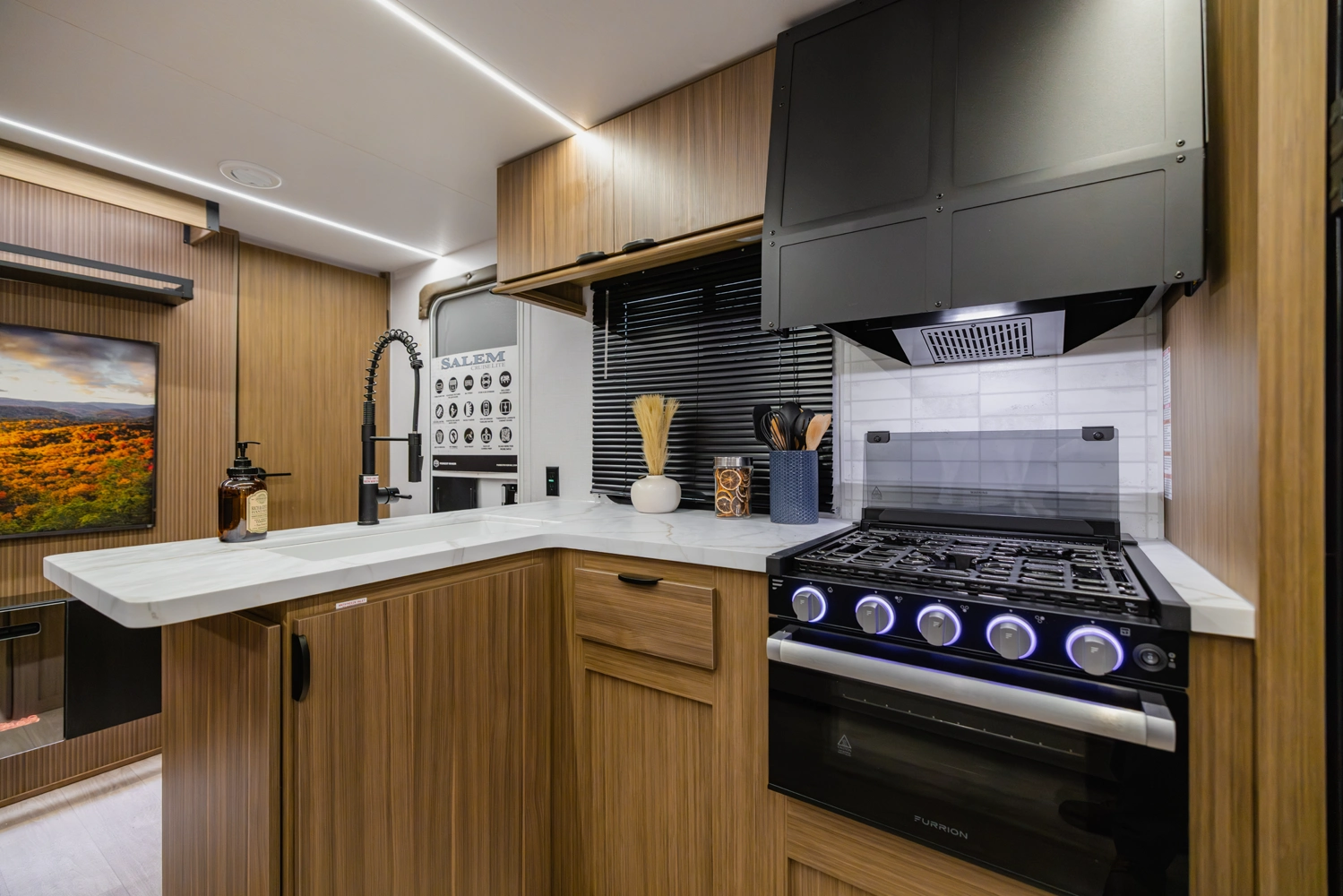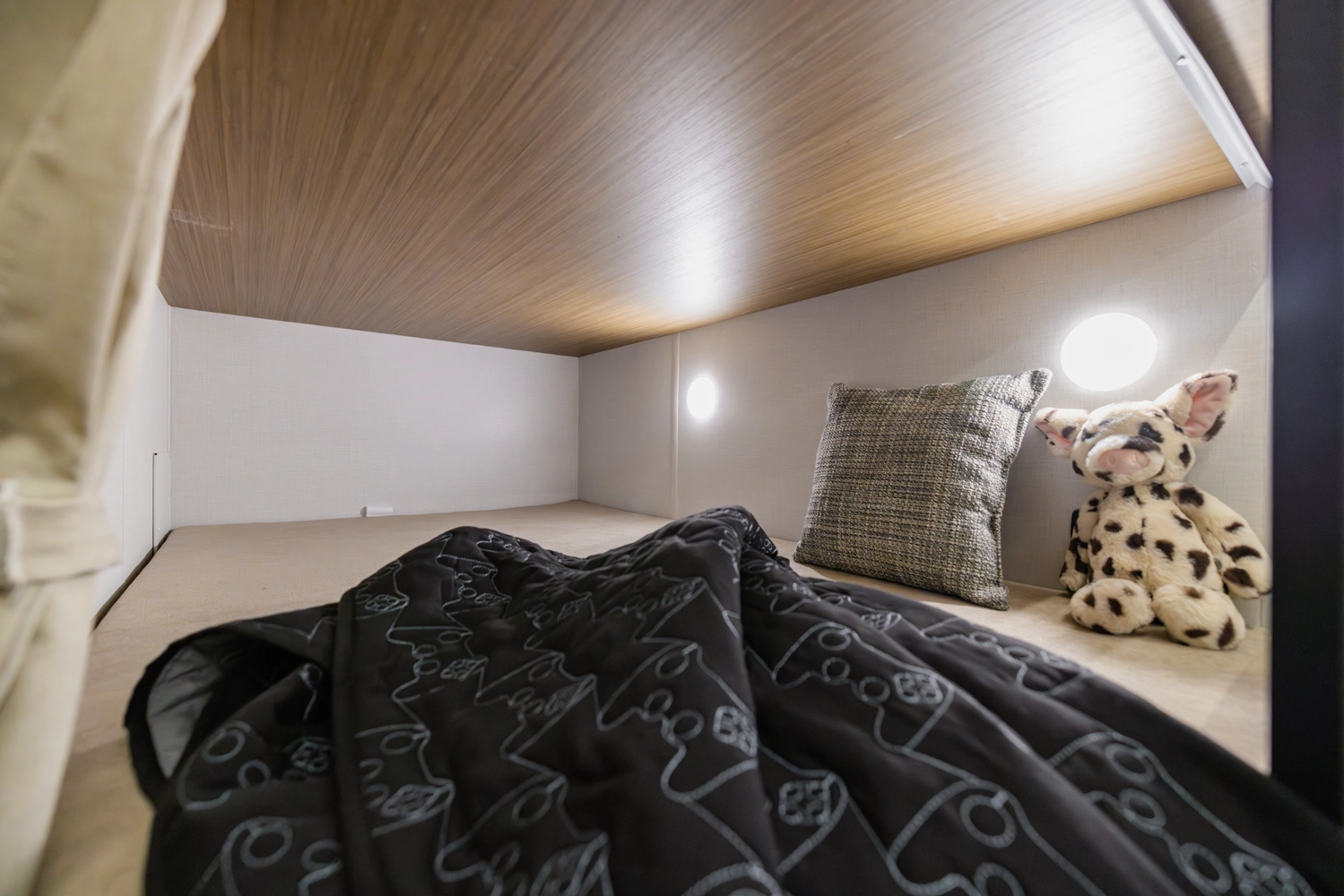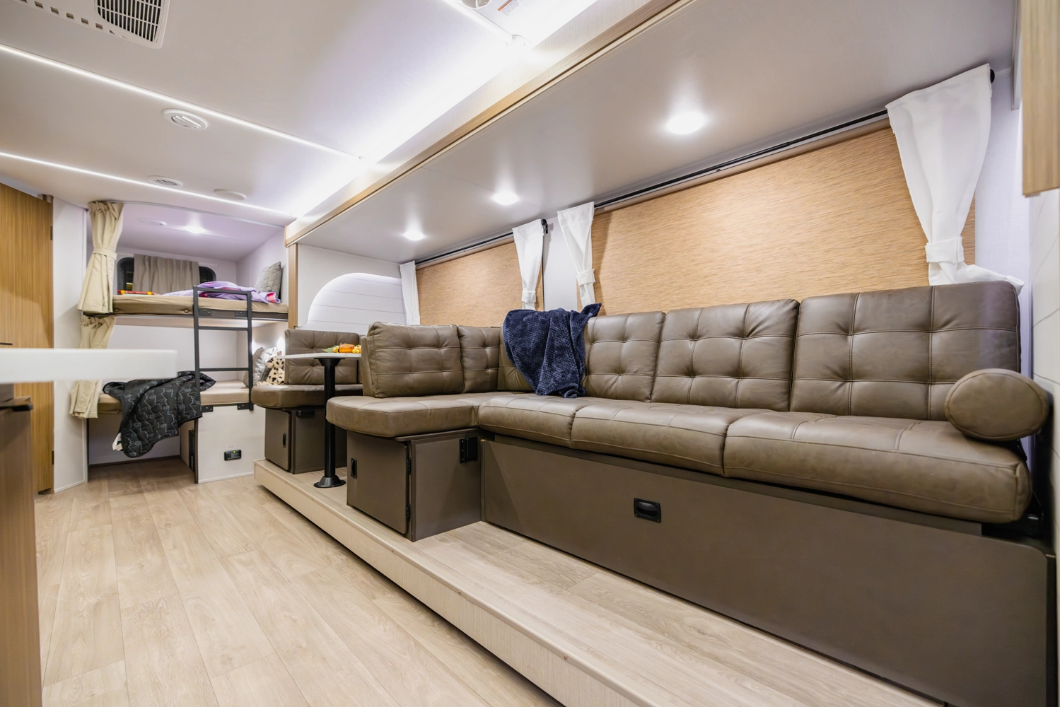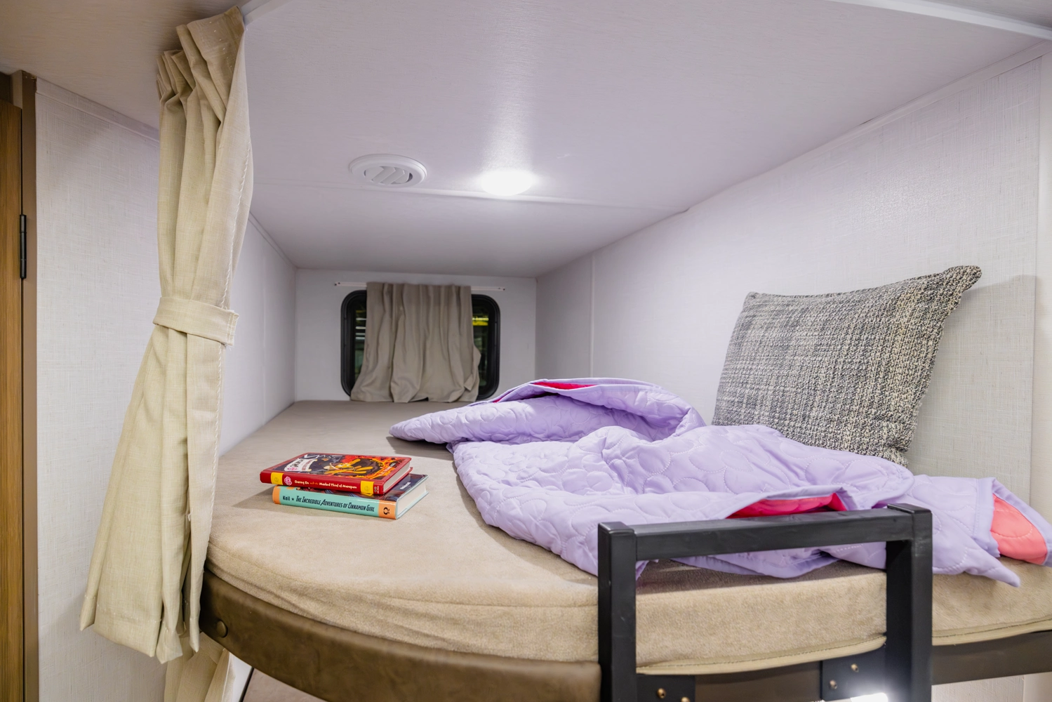 The 263BHXL is perfect for family travels. The rear features two oversized bunks for the kids, with plenty of space to stretch out. The grown-ups will sleep soundly in the front queen bedroom, which includes hanging closets and under-bed Stow N Go Storage. The living area includes panoramic windows and the Versa-Lounge. The kitchen provides a 11 CU. FT. refrigerator and TONS of storage.